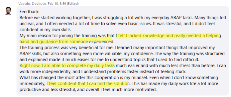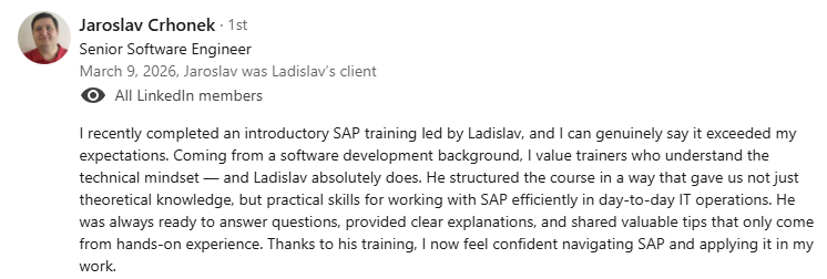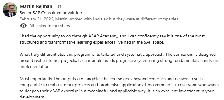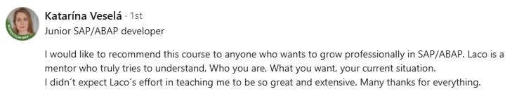 "Thanks to Ladislav, I was able to achieve my goal of working remotely and start earning with ABAP. In just one month of training, I signed my very first contract that combined my 10+ years of senior-level functional expertise with my newly acquired ABAP skills."
